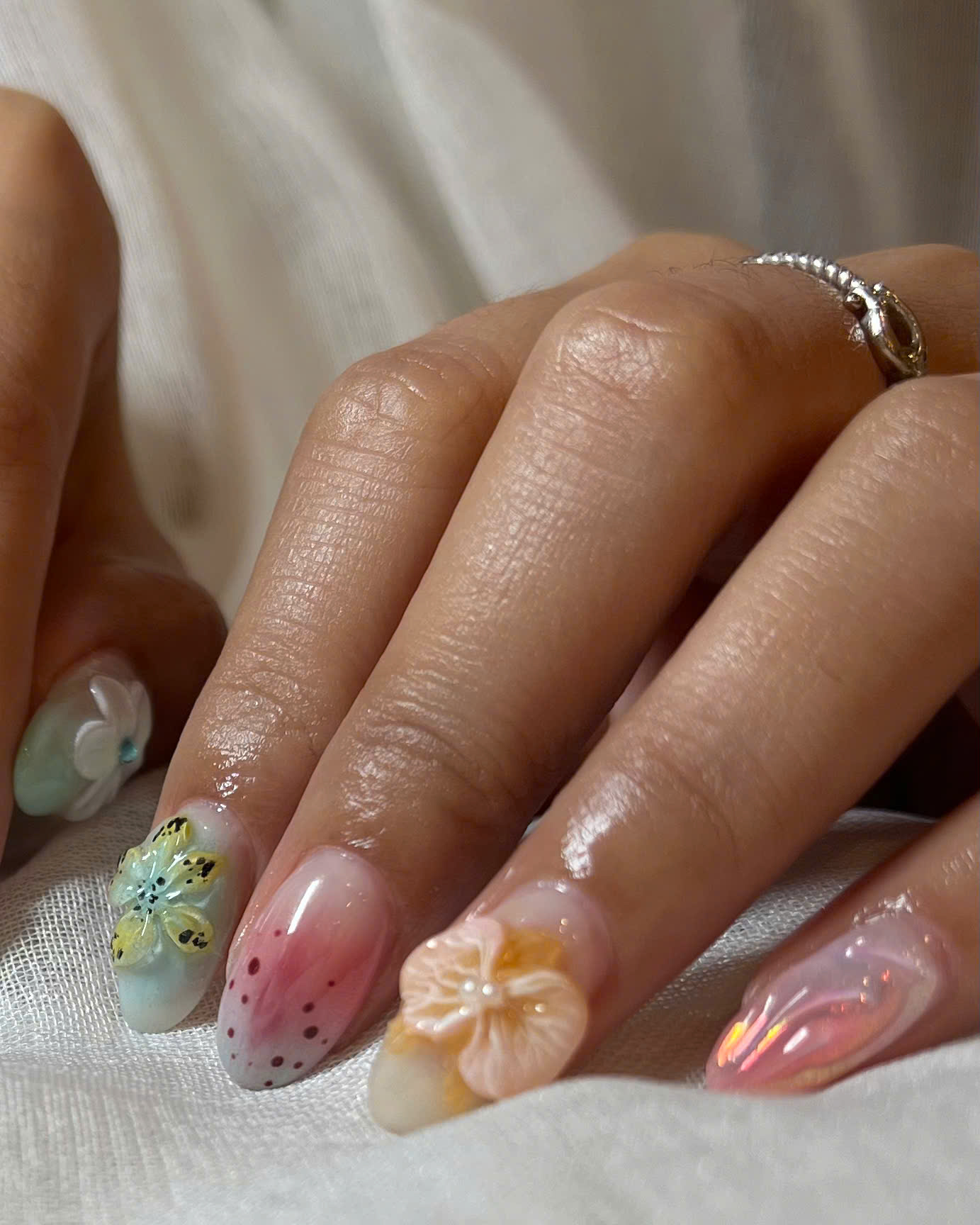 In recent years, this nail service has become extremely popular. With this technique, we embed mother-of-pearl pieces onto fingernails and toenails in visually appealing and attractive designs. Mother-of-pearl accessories are widely used in nail decoration, available in various sizes and types, including shell flakes and stone shell pieces. With a touch of creativity, we create artistic masterpieces on our customers’ nails.